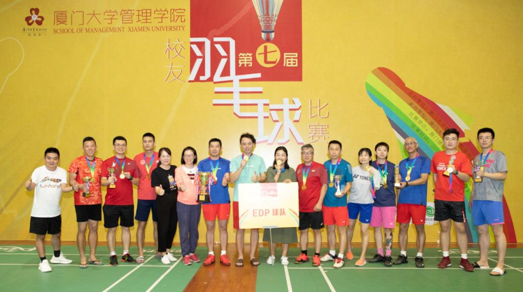 EDP羽毛球俱乐部于2017年3月21日正式成立,目前已有超50名会员,会员覆盖厦门各行业的企业高管。从2013年起球队初建,至今已连续6届组队参加厦大管院校友羽毛球赛,并在2016/2017/2018/2019夺得四连冠。球队有聘请专业教练定期给予授课指导,帮助球员提升球技。球队不定期与厦漳泉以及省外羽毛球俱乐部进行友好交流,不仅锻炼了临场作战的能力,也结识了众多羽毛球爱好者。除了与各俱乐部的交流比赛以外,俱乐部也积极参与厦门以及周边城市举办的各项业余羽毛球赛,并取得较好的成绩。