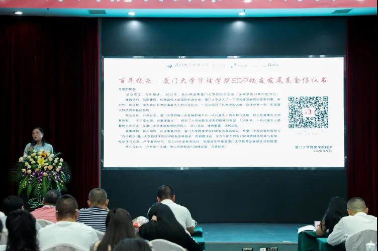 管院EDP中心副主任陈萍老师简要介绍了建立“百年校庆•厦门大学管院学院EDP校友发展基金”的设想,倡议校友们为厦大的发展壮大尽绵薄之力,为EDP的校友发展汇集力量。
