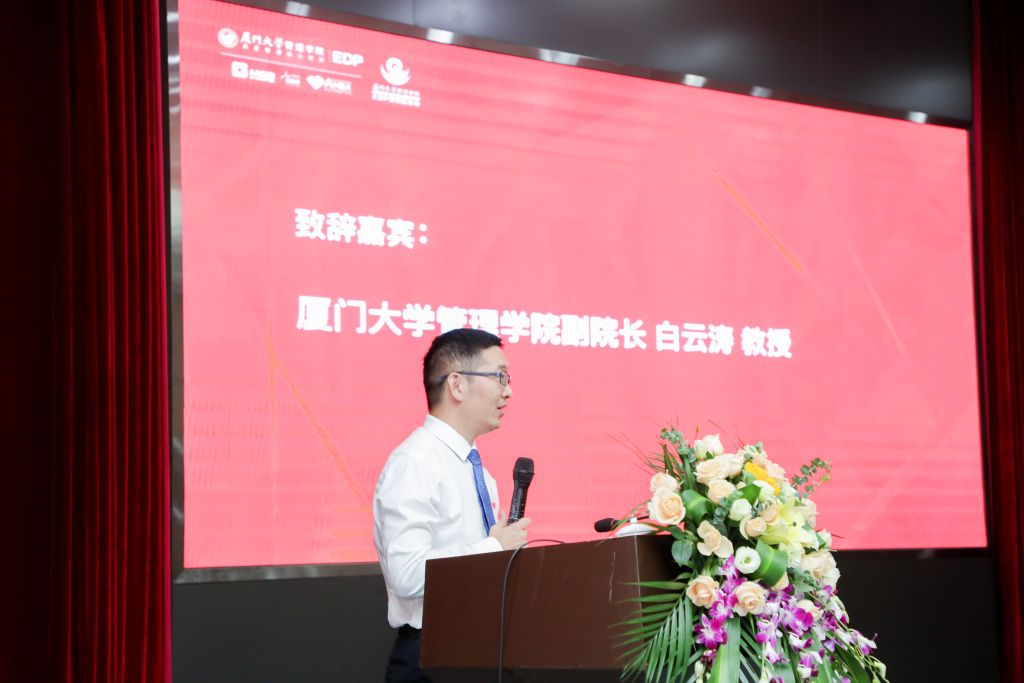 厦门大学管理学院副院长白云涛教授首先代表学校致辞,他对EDP漳州校友会努力在学员之间、学员及企业与学院之间搭建学习、交流平台的做法,以及校友会丰富多彩的活动形式给予了充分肯定,期待漳州校友克难攻坚,勇于奉献,稳步发展开创新的未来,在漳州经济、社会、文化建设各领域发挥排头兵作用。