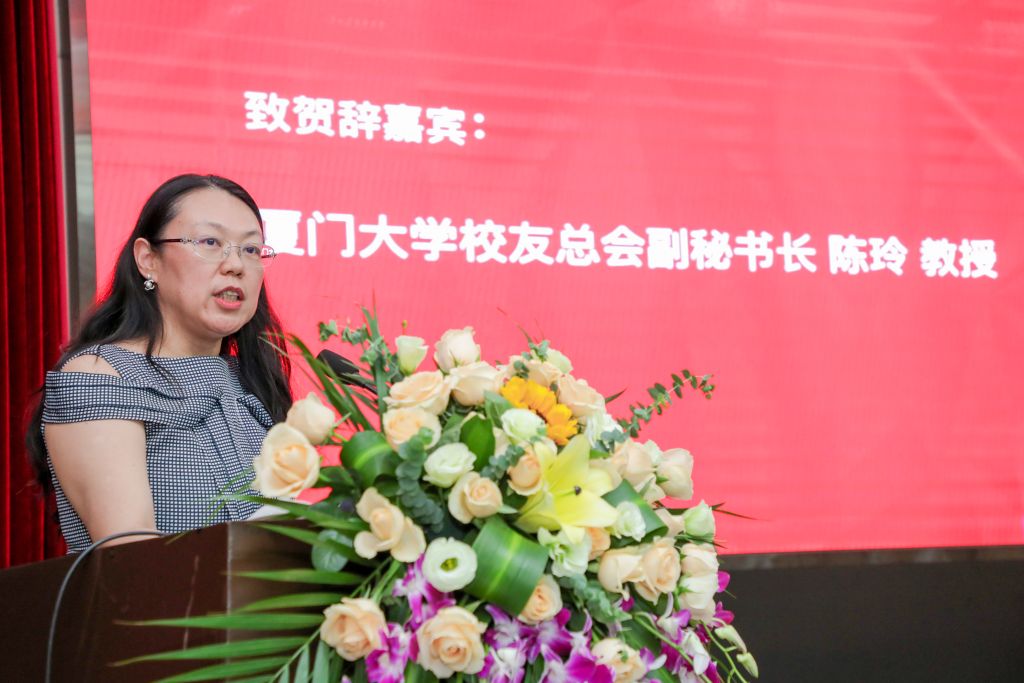 厦门大学校友总会副秘书长陈玲教授(中)为创会会长杨明元(右)、新任会长黄跃琛授牌。