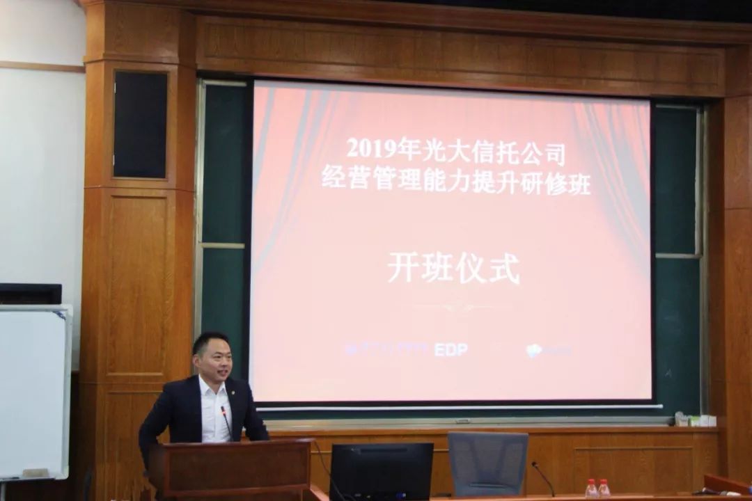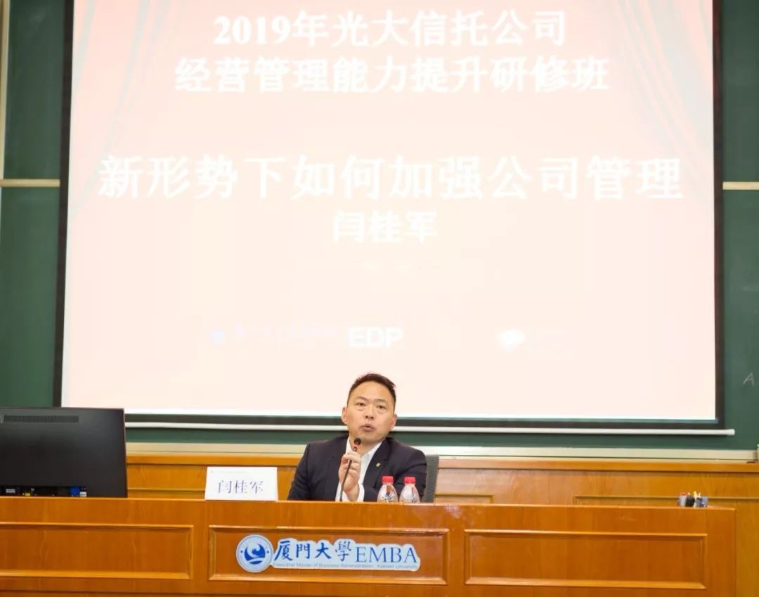 2019年3月25日,光大信托公司经营管理能力提升研修班在厦门大学管理学院隆重开班。来自光大信托公司各部门、区域总部(筹备组)总经理助理级以上干部、团队负责人共计63人参加此次培训。厦门大学副校长叶世满、厦门大学管理学院党委书记邱七星、光大兴陇信托有限责任公司党委书记、总裁闫桂军先生出席开班仪式并致辞。