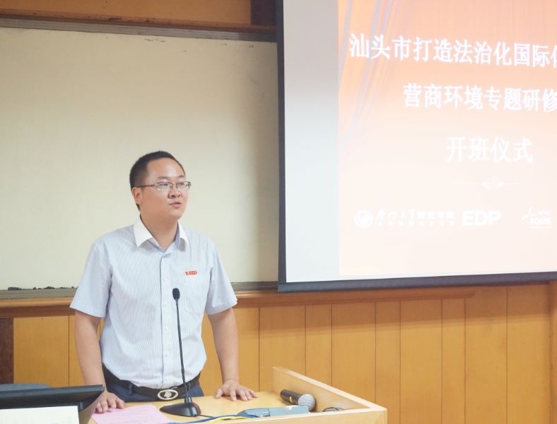 7月23日上午,汕头市领导干部打造法治化国际化便利化营商环境专题研修班正式开班。汕头市委组织部副处级组织员周潮,厦门大学管理学院EDP中心副主任刘端填出席开班仪式。