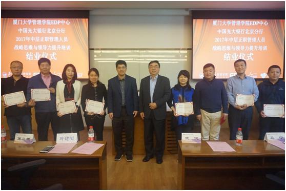 最后厦门大学管理学院院长叶建明教授,中国光大银行总行副行长、北京分行行长武健先生共同为本次参训学员颁发结业证书。结业仪式在掌声中圆满落幕。