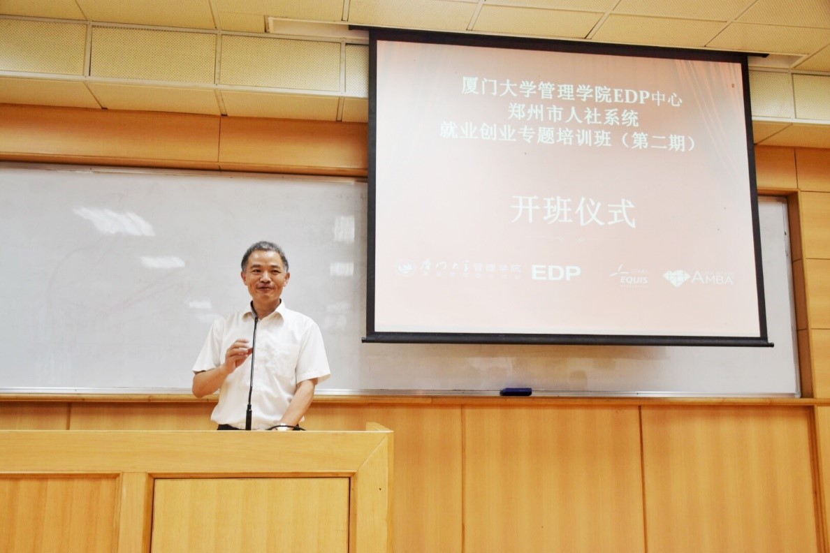 厦门大学管理学院院长助理朱平辉教授、郑州市人力资源和社会保障局领导刘国庆先生和郑州市人社系统就业创业专题培训班学员们出席了本次开班仪式。朱平辉教授与刘国庆先生分别致辞,项目主管唐绮女士主持本次开班仪式。