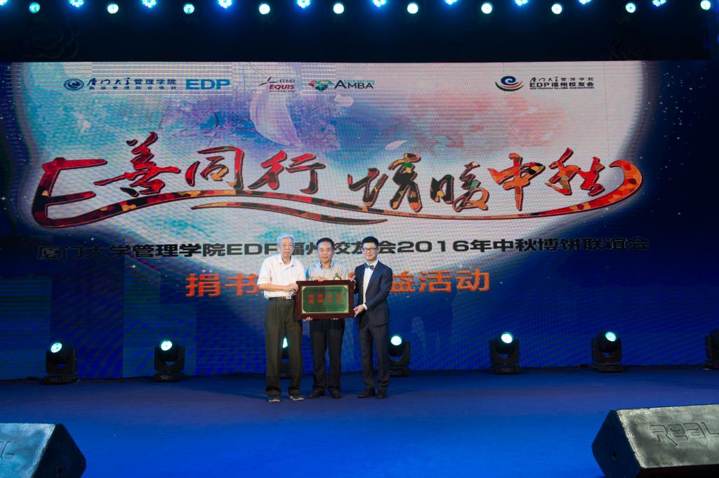 今年闽清县遭受台风打击,损失严重,EDP福州中心不但自己向灾区捐出价值17.5万元的后备电源,还号召同学们献出爱心。在短短的一个星期内,就收到善款71600元。校友会联系了教育厅关工委,为受灾的学生带去我们的爱心。我们捐赠了七万一千六百元的书籍,有716名学生受助,已经覆盖了闽清教育局统计的所有受灾学生。晚宴间福建省教育系统关工委主任、原教育厅厅长郭荣辉先生上台,为福州校友会赠爱心牌匾并致辞感谢。