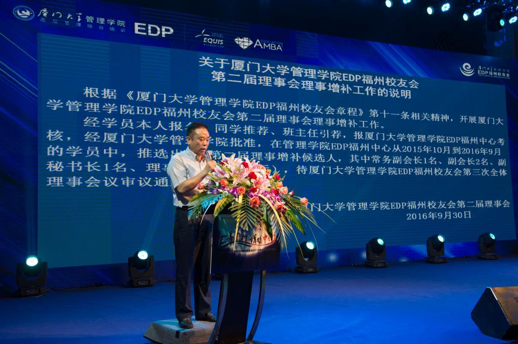 厦门大学管理学院EDP福州校友会理事会刘平山会长代表校友会第二届理事会作工作报告。报告总结到,EDP福州校友会自创会以来,已历四年,秉持着“财富·健康·爱心”的活动宗旨,校友会共举办9次理事活动,召开7次会长秘书长工作会议,各俱乐部也开展了各项丰富多彩的活动,这些活动加强了校友之间及校友和母校间的联系交流。
