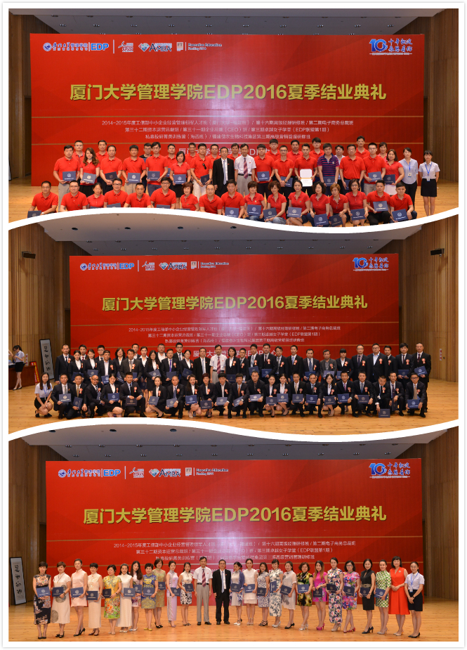 在厦门大学管理学院EDP成立十周年之际,又一批企业家学员顺利结业,即将走出校园。在美丽的芙蓉湖畔科学艺术中心满堂祝福语,只赠学子行。7月15日这天下午,厦门大学管理学院EDP2016年夏季结业典礼如期举行。厦门大学管理学院副院长戴亦一教授、党委副书记李峰老师、管理学院EDP中心主任朱平辉教授、副主任陈萍老师、刘端填老师、兴业证券财富管理学院副院长阮国男先生、福建傲农生物科技集团股份有限公司集团副总裁叶俊标先生、厦门大学管理学院EDP校友会常务副会长唐桂英女士、副会长陈寿睦先生、副会长张明辉先生以及各班班主任出席典礼,并与结业学员们共同见证了这一激动又难忘的时刻。