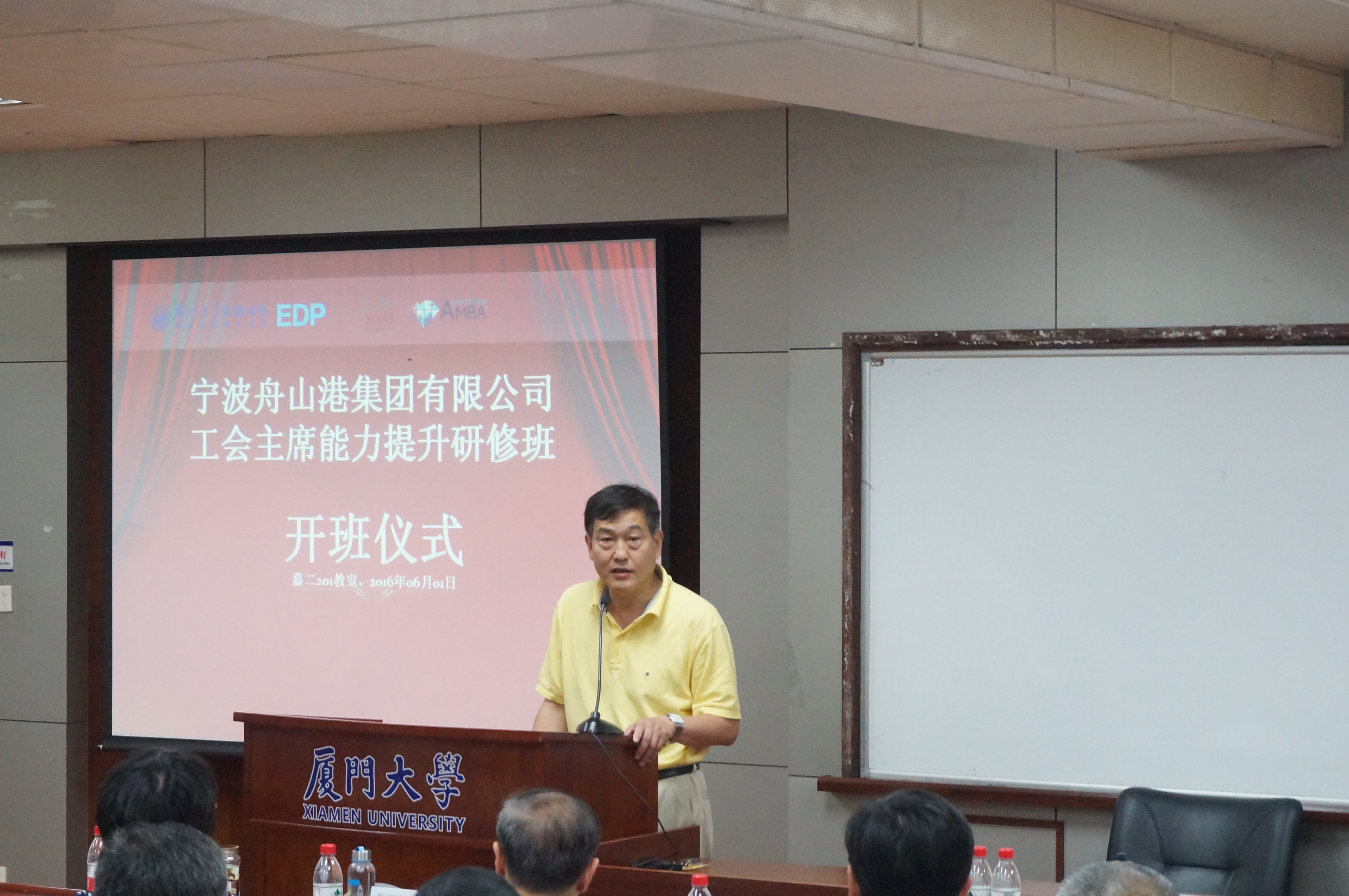 出席本次开班仪式的领导有:厦门大学管理学院党委副书记洪秋霞老师,宁波舟山港集团有限公司工会主席陈国荣先生,宁波舟山港集团有限公司工会副主席、经审会主任林巧女士,厦门大学管理学院EDP中心副主任章永奎老师。洪秋霞副书记与陈国荣主席分别发表了致辞,章永奎老师主持了本次开班仪式。