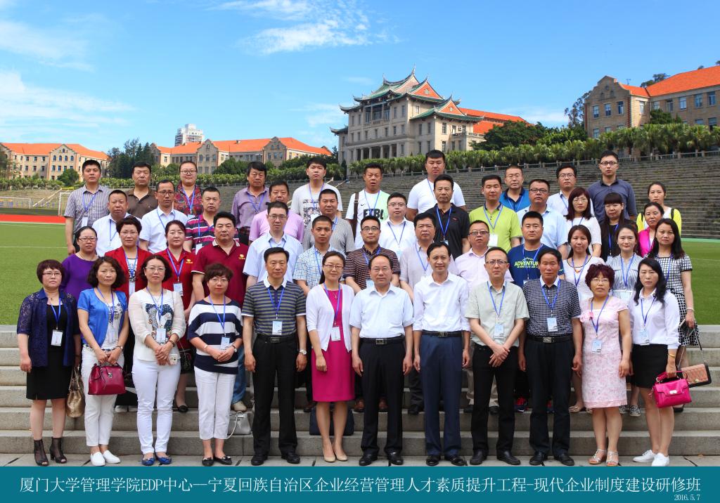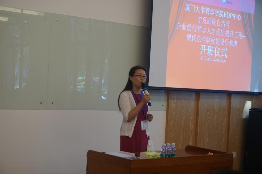 2016年5月7日上午,厦门大学管理学院宁夏回族自治区企业经营管理人才素质提升工程——现代企业制度建设研修班在嘉庚一号楼102室举行隆重的开班仪式。厦门大学管理学院党委副书记李峰老师、宁夏回族自治区非公有制经济服务局副局长魏继义先生、宁夏经济管理干部培训中心副主任税丽女士出席典礼并致辞,管理学院EDP中心副主任刘端填老师主持开班仪式。