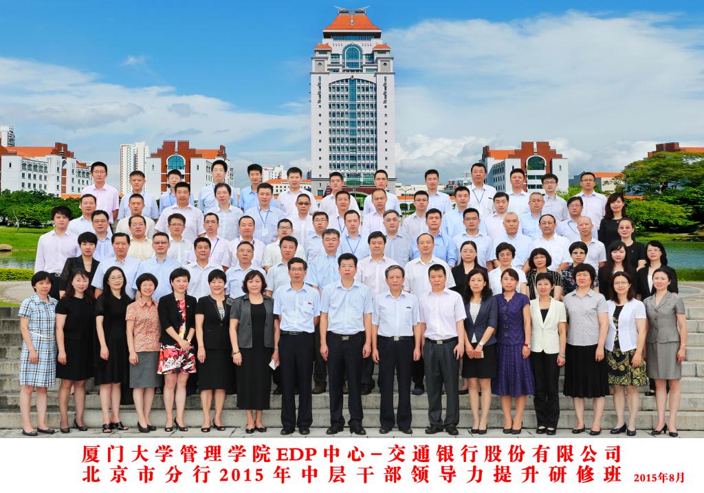 为深入学习贯彻中央经济金融方针政策和总分行党委决策部署,充分认识交行深化改革、转型发展的必要性和紧迫性;主动适应经济新常态,努力探寻分行转型发展的新路径、新举措,不断提高经营管理和创新发展能力,交通银行股份有限公司北京市分行和厦门大学管理学院联合举办“分行中层领导力提升”专题研修班。2015年8月24日,厦门大学管理学院EDP——交通银行股份有限公司北京市分行2015年中层干部领导力提升研修班在厦门大学群贤二201教室顺利开班。出席开班仪式的领导有:厦门大学管理学院党委书记沈维涛教授,交通银行北京市分行副行长果志刚先生。厦门大学管理学院EDP中心副主任章永奎副教授主持开班仪式。