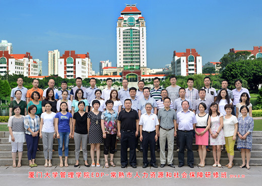 2014年8月20日上午,江苏省常熟市人力资源和社会保障厦门大学研修班在嘉庚二号楼205教室顺利开班。此次研修班为期4天,课程包含《新形势下的台海局势和两岸关系》、《传统文化中的管理哲学》、《健康管理》、《中西方文化的交流与冲突》、《宏观经济形势分析》、《利益诉求与社会保障》。厦门大学管理学院EDP中心主任朱平辉教授出席开班仪式并致辞,仪式由管理学院EDP中心骆莹莹老师主持。