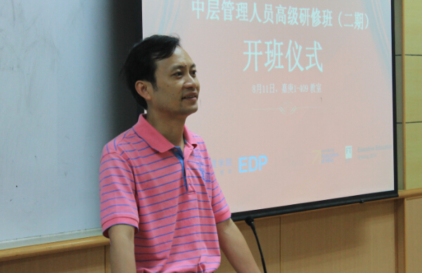 在开班仪式上,李峰书记首先代表学院对远道而来的石家庄光大银行的朋友表示热烈的欢迎,紧接着,李峰书记向学员们详细的介绍了厦门大学管理学院EDP的历史,以及EDP中心的含义,阐述了厦门大学管理学院EDP中心目前在全国乃至全世界商学院中趋于一个先进的位置,希望在座的各位学员能够珍惜这次学习的机会,借助学习的机会学好知识,利用课余的时间去了解厦门的人文轶事、走进咱们的中国最美丽大学——厦门大学,用心去体会厦门大学的悠久历史,用思想去品读厦门大学的人文气息,用灵魂去感触厦门大学的南强精神。