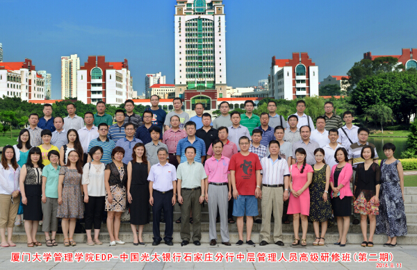 2014年8月11日上午,光大银行石家庄分行中层管理人员(二期)高级研修班在嘉庚一号楼409教室顺利开班。此次研修课程为期5天,授课主题包含《优秀管理者的四项修炼》、《从财务报表看企业竞争力》、《商业银行信贷风险预警与风险防范》、《经济发展周期与金融市场》、《绩效沟通与辅导》、《商业银行市场营销与关键客户管理》。厦门大学管理学院党委副书记李峰老师出席开班仪式并致辞,仪式由厦门大学管理学院EDP中心主任朱平辉教授主持。
