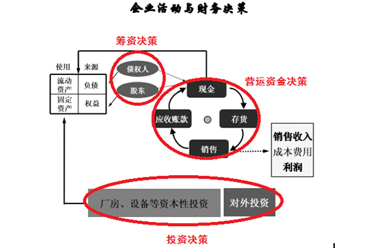 林老师说供、产、销、人、发、财是工业企业几个最基本的职能部门,尽管“财”放在最后一位,但并非代表财务管理不重要,相反,财务管理因贯穿了企业活动的整个过程而显得尤其重要(如下图所示,从筹资到投资,再到运营,企业的财务决策在企业活动中无处不在)。