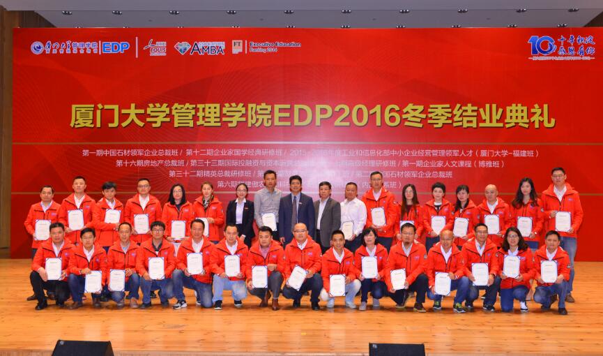 今天下午,厦门大学管理学院EDP2016年冬季结业典礼如期而至。厦门大学管理学院院长叶建明教授、副院长徐迪教授、管理学院EDP中心主任朱平辉教授、副主任吴育辉副教授、副主任刘端填老师以及各班班主任出席典礼,并与结业学员们共同见证了这一激动又难忘的时刻。