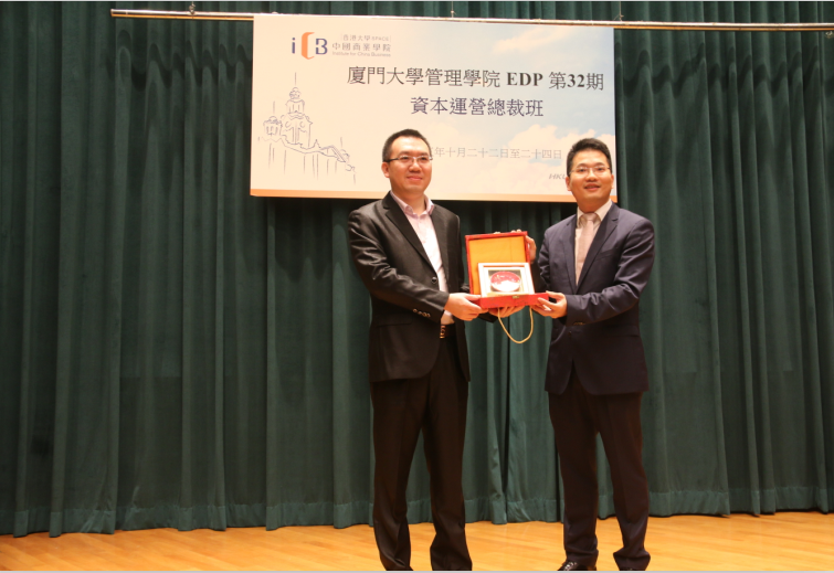 首先由香港大学SPACE学院苏友金博士致欢迎辞。紧接着,由32资学员代表徐炜同学代表厦门大学管理学院EDP和香港大学SPACE学院互赠礼品。