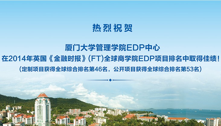 2014年5月12日,英国FT(《金融时报》)公布2014年度全球商学院高管教育培训排名,厦门大学管理学院EDP项目凭借国际前沿的培养理念、全球领先的合作模式、终身学习的服务精神,跻身全球50强榜单,综合排名位列全球第46名(其中内训项目位列第46名,公开项目位列全球第53名)。