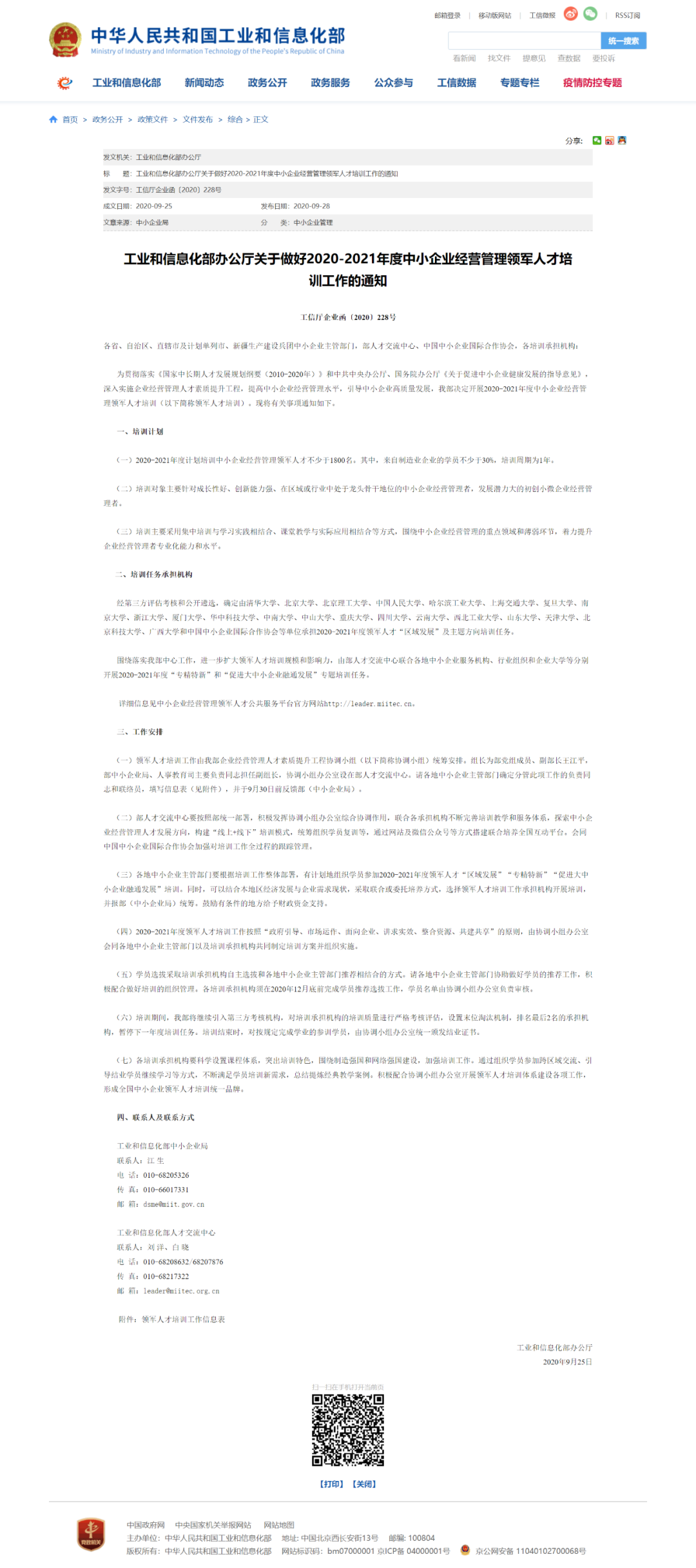 为贯彻落实《国家中长期人才发展规划纲要(2010-2020年)》和中共中央办公厅、国务院办公厅《关于促进中小企业健康发展的指导意见》,深入实施企业经营管理人才素质提升工程,提高中小企业经营管理水平,引导中小企业高质量发展,我部决定开展2020-2021年度中小企业经营管理领军人才培训(以下简称领军人才培训)。现将有关事项通知如下。
