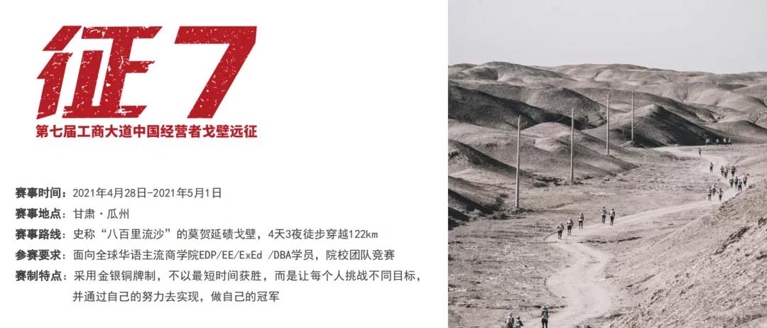 第七届工商大道中国经营者戈壁远征是面向商学院高层管理人员的最大规模、最具影响力、最具文化深度的赛事,以院校组队的方式4天3夜远征122km莫贺延碛戈壁,被誉为“中国经营者的精神征途”。
