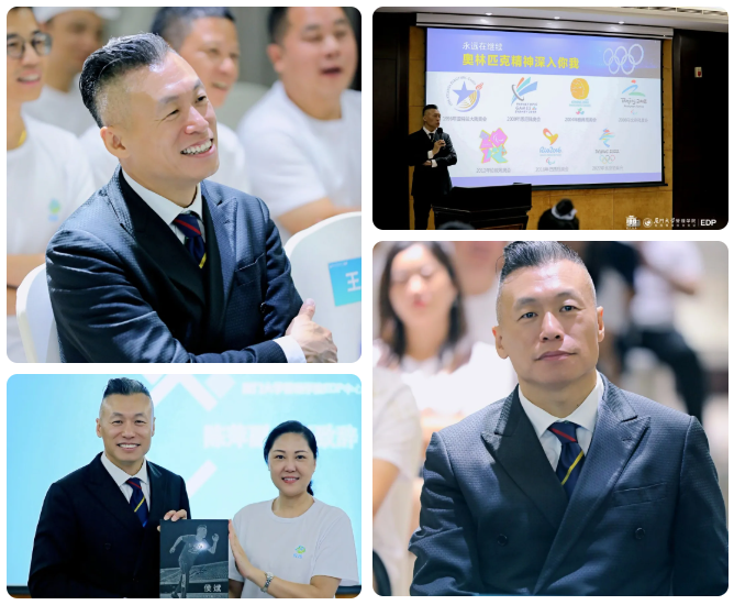 从体育训练出发,谈到戈壁徒步,再延展至企业发展的对标、思维拓展,侯斌分享了自己奥运历史上的三个“逆境思维”:1991年工厂领导一句话:贵人的支持带领我们走出困境;1993年裁判一句话:全球“背越式”,寻求改变“鱼跃式”跳高;1996年德国选手一句话:善待身边的人和事,活出爱的模样。