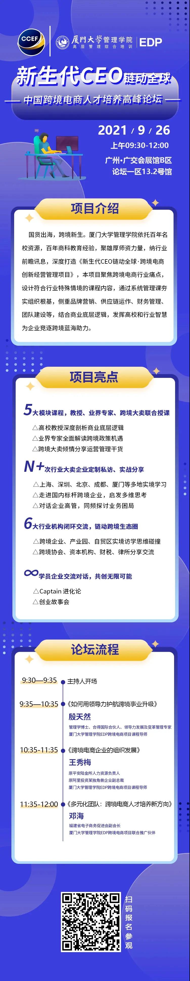 2021年9月26日上午9:30—12:00,由厦门大学管理学院EDP中心主办的《新生代CEO链动全球,中国跨境电商人才培养高峰论坛》将在2021中国跨境电商交易会期间举办。