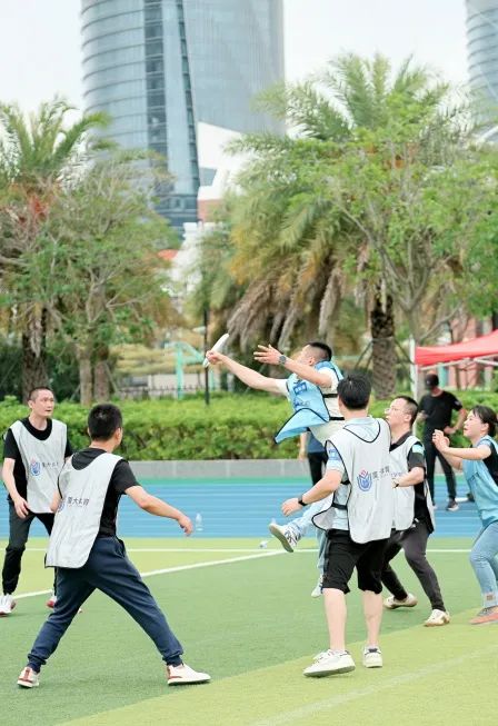 欢乐的笑声回荡在演武场上空,青春气息恣意挥洒。三百余名新生热情参与飞盘挑战,在青青草坪映衬下,那些迷茫和遗憾,那些焦虑和犹豫,都被白城的海风,芙蓉湖畔的云,演武场的阳光治愈了,连绵了一个春季的雨都停了。