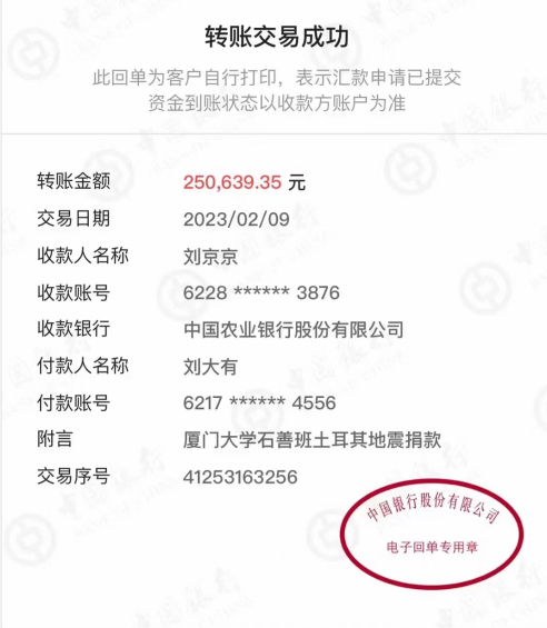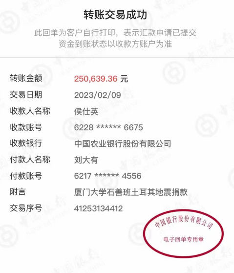 2月7日-8日石善汇秘书处为确保每一分善款都直接用在最急需的震区救灾,一直忙碌着与前线保持联络,并将所有厦门大学管理学院石善班善款共计864915.71元(人民币)分3笔全部捐往土耳其慈善组织用于直接购买赈灾物资送到地震重灾区