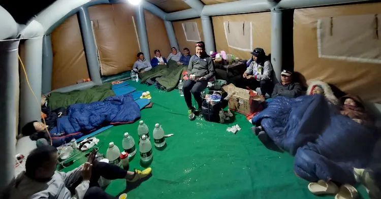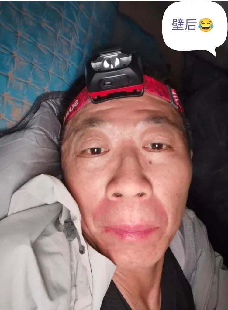 4月18日晚上8时许,吃完晚饭后队员们正在搭建小帐篷,我望见一台台汽车正开进营地,把我们的帐篷包围起来,有的车上还贴着“转移”两个大字,我心里犯嘀咕可能有大事儿发生。果然一会儿狂风大作,有人大喊“沙尘暴来了”!8、9级的沙尘暴迅速摧垮了队部大帐篷,我们按照组委会的决策,就地抗风暂不撤离,但必须躲进自己的小帐篷,任由风沙吹袭,沙尘不断地刮进帐篷,防潮垫、驼袋和身上羽绒服、裤子、头巾洒满了沙尘,只能坐在帐篷里听着外面呼啸而来又呼啸而去的肆虐声声,全无睡意。下半夜1:00之后风力渐弱,大家纷纷钻出帐篷,映入眼帘的是一片狼藉,随后大帐篷重新搭建起来,有的队员跑进大帐篷聊天、休息。2:00多我钻进满是沙尘的睡袋,在小帐篷里睡着了。