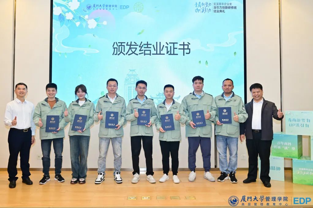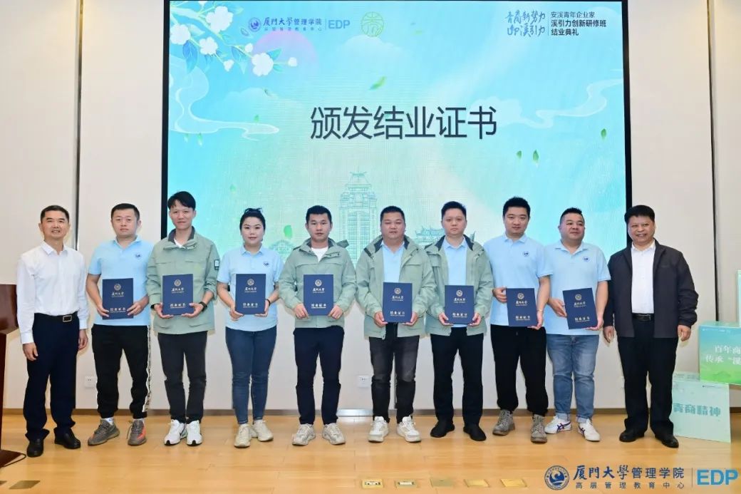 2023年11月25日,厦门大学-安溪青年企业家溪引力创新研修班在厦门大学圆满结业。厦门大学管理学院党委书记张明智作为校方代表出席结业典礼;安溪县委组织部部长邱志民,安溪团县委书记陈志刚,安溪县委组织部办公室负责人陈德进代表安溪县领导班子出席结业典礼;安溪县青年商会会长杨江勇以及安溪青商会第二届理(监)事会代表安溪青商会出席典礼,共同为安溪青年企业家溪引力创新班历时一年半的学习旅程画下圆满的句号。结业典礼由厦门大学管理学院EDP中心副主任吕雯主持。