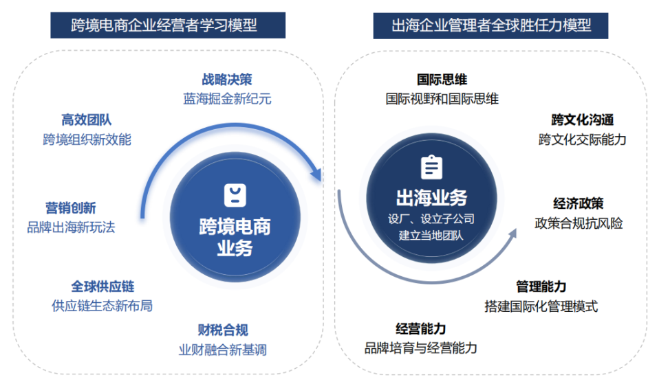 综合上述对新锐跨境品牌和传统制造企业的出海路径分析,出海企业亟需培养的管理人才不仅要具备越海拓疆的创业经营能力,还要具备跨国团队管理能力,才能有效支持企业出海战略的落地与执行。