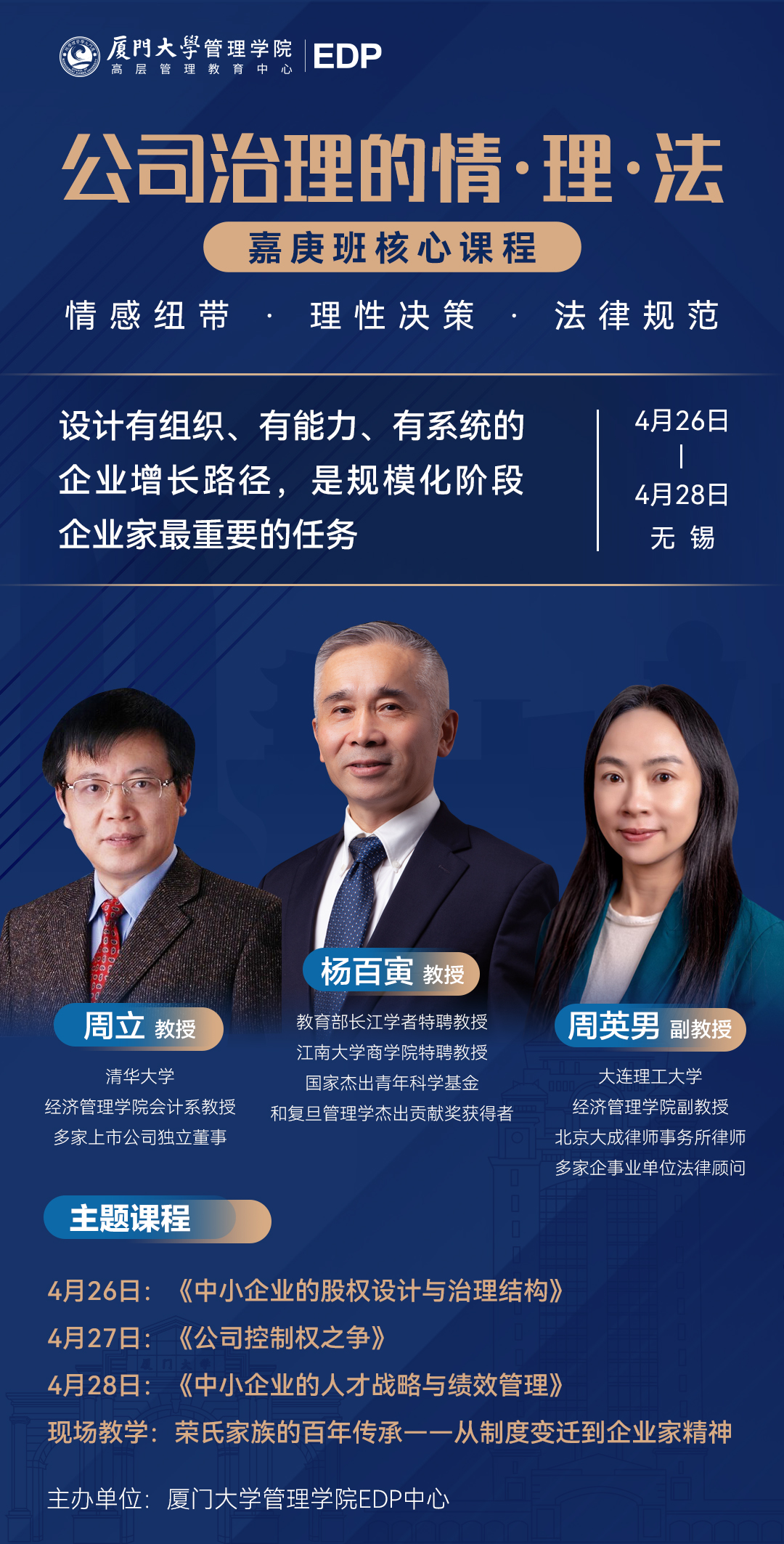 嘉庚传承·领创未来(董事长课程第7期)核心课程《公司治理的情、理、法》将围绕公司治理的情感纽带、理性决策与法律规范三个维度展开教学。